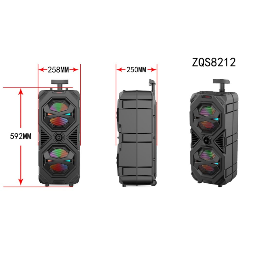 اسپیکر قابل حمل 8212 یکی از پر فروش ترین محصولات شرکت Zqs می باشد که طراحی بسیار شیک و منحصر به فردی دارد. این دستگاه شامل دو ساب 8 اینچی است که به سبب آن صدای فوق العاده بلند را تولید می کند. همچنین این اسپیکر امکانات بلوتوث، فلش، مموری، رادیو ، رقص نور و ... را دارد. با این اسپیکر یک عدد میکروفون بیسیم عرضه شده است. این اسپیکر داری قابلیت ویژه TWS است که توسط آن می توانید دو عدد از این اسپیکر را از طریق شبکه بیسیم به هم دیگر متصل و از صدایی استریو و جذاب لذت ببرید.